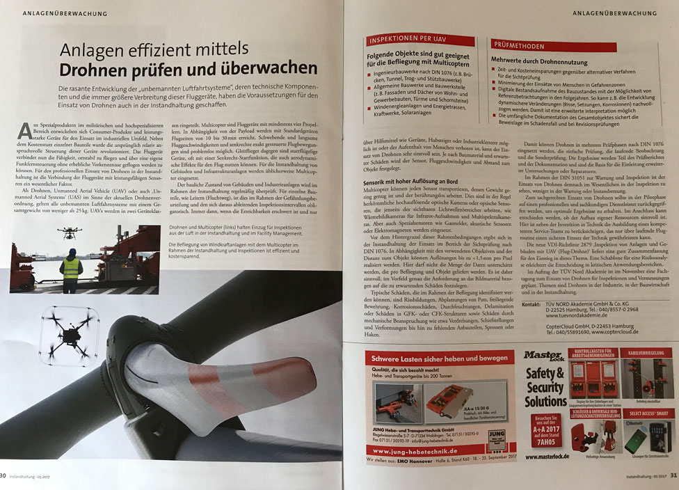 Für die wasserseitigen Fassaden und Infrastrukturanlagen im Hamburger Hafen haben wir seit 2017 diverse Befliegungen mit unseren Drohnen durchgeführt. Wir erstellen Fotodokumentationen vom Zustand der Bausubstanz im laufenden Betrieb. Unsere Inspektionsteams verfügen über Einsatzerfahrung im industriellen Umfeld und verfügt über die erforderliche Equipment und PSA.
